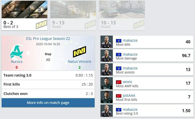 Aurora показала хорошую игру в первой половине на обеих картах, однако после смены сторон не смогла удержать преимущество. На Nuke турецкий состав провалил атаку, а на Dust2 не справился с защитой.