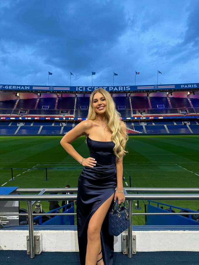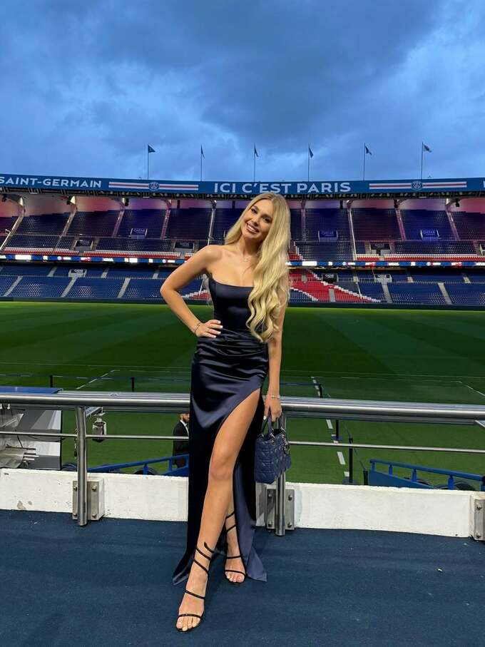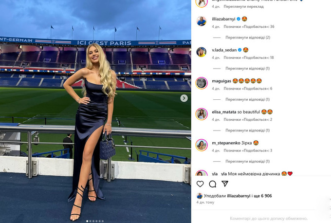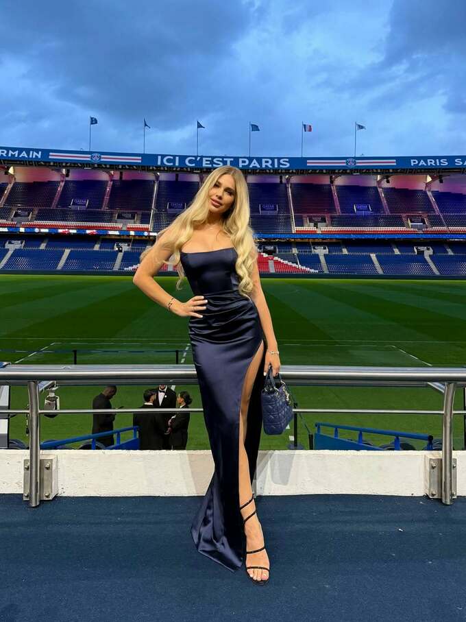 Ангелина Забарная, жена защитника ПСЖ и сборной Украины Ильи Забарного, появилась на трибунах стадиона «Парк де Пренс» в роскошном темно-синем платье с высоким разрезом.