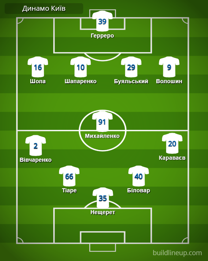 «Динамо» Киев: Нещерет – Вивчаренко, Тиаре, Беловар (Захарченко, 30), Караваев – Шапаренко (Бражко, 76), Михайленко, Буяльский (Пихаленок, 61) – Шола (Кабаев, 60), Герреро (Бленуце, 76), Волошин.