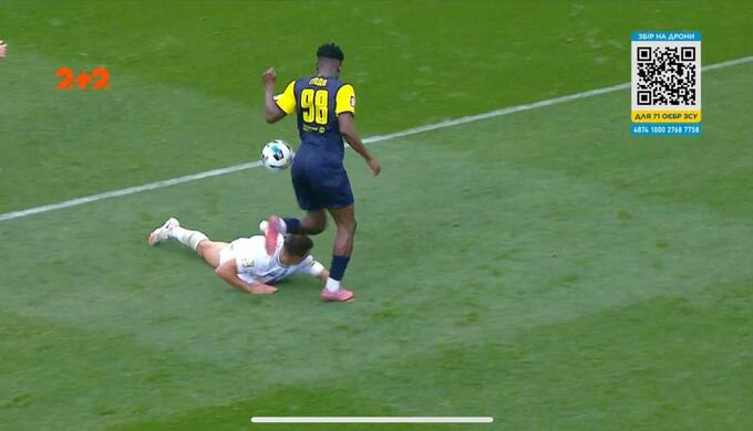 Легионер харьковского «Металлиста 1925» Питер Итодо во время игрового момента наступил на руку защитнику киевского «Динамо» Константину Вивчаренко.