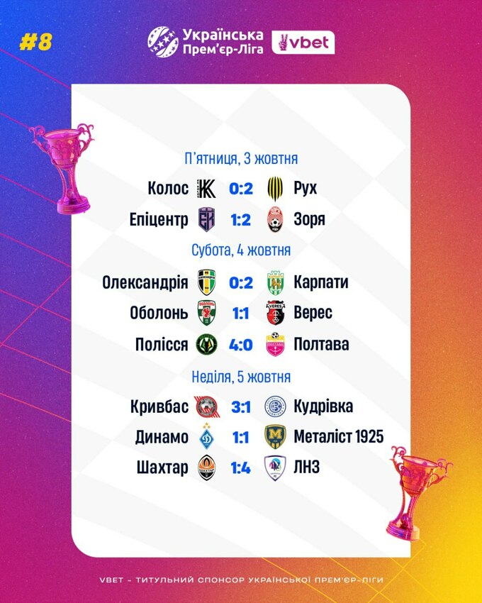 С 3 по 5 октября состоялся 8-й тур Украинской Премьер-лиги 2025/26.