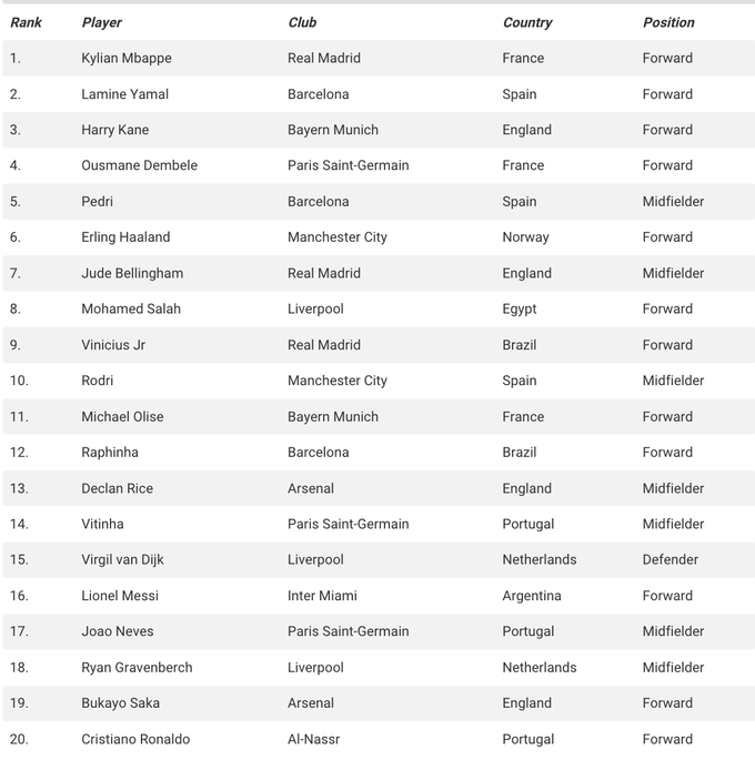 Первую позицию в рейтинге занял звезда «Реала» Килиан Мбаппе, который пока является лучшим бомбардиром Лиги чемпионов и Ла Лиги.