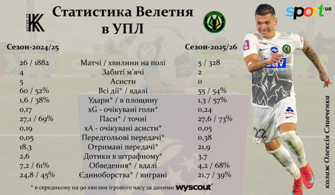 Глобально говоря, после перехода в «Полесье» Велетень точно не продемонстрировал настолько стремительный прогресс, в сравнении с его выступлениями за «Колос», чтобы тем самым заслужить вызов в сборную Украины. Да, по ряду игровых показателей Владислав действительно прибавил (например, стал больше вовлечен в командные взаимодействия, получая больше передач от партнеров, или начал действовать острее, предпочитая больше касаться мяча непосредственно в штрафной соперника), однако легко можно отыскать и обратный пример – регресс по также достаточно важным компонентам (к примеру, Велетень стал меньше участвовать в единоборствах и выходить из них победителем, а также значительно сдал в показателе обводок, хотя в УПЛ-2024/25 был лучшим украинцем в этом статистическом блоке, уступая в целом в чемпионате лишь бразильцам, которые уже покинули Украину – Кевину из «Шахтера» и Хуану Альвине Безерре из «Александрии»).