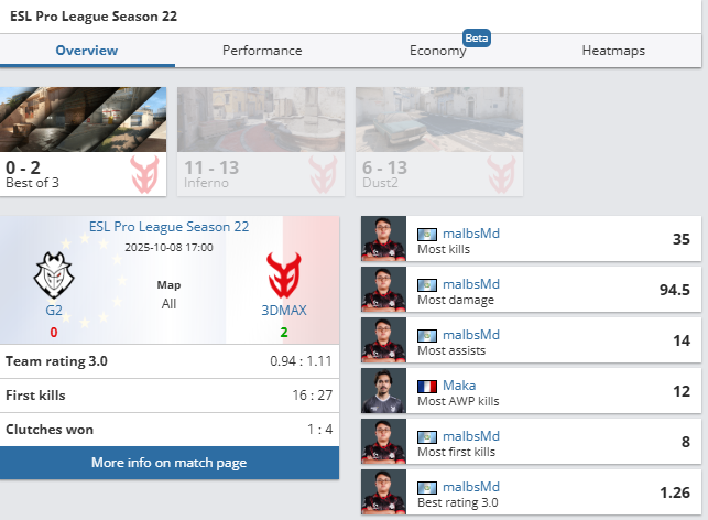 Команда 3DMAX продолжает удивлять на ESL Pro League Season 22 – французский состав выбил G2 Esports, победив со счетом 2:0 (Inferno 13:11, Dust2 13:6), и впервые в своей истории вышел в плей-офф крупного турнира.