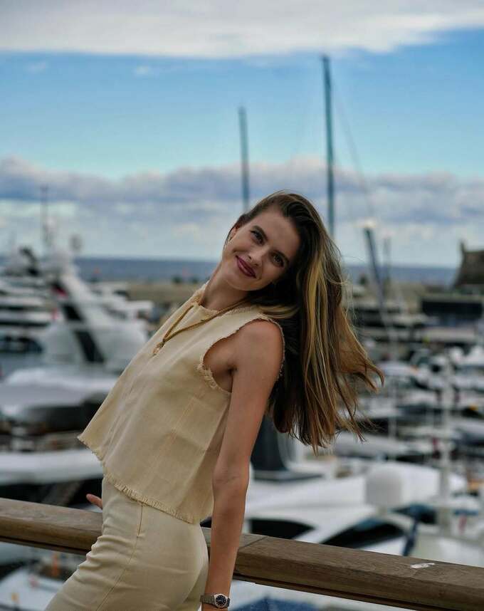 На фото спортсменка позирует на фоне яхт и Средиземного моря в светлом летнем костюме.