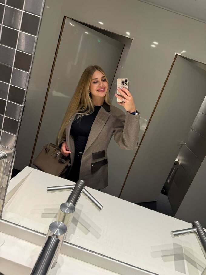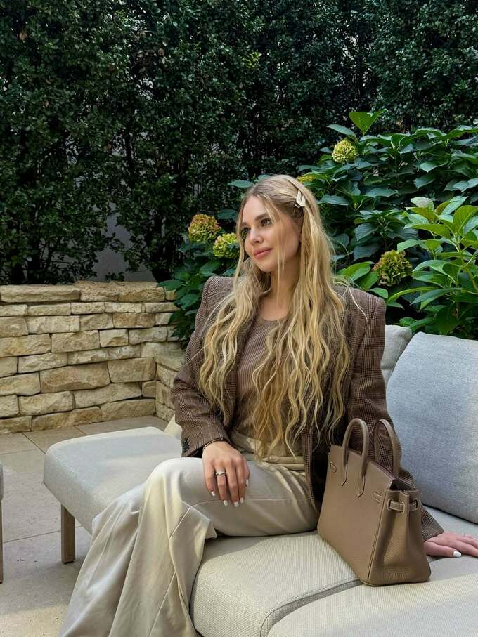 На фотографиях Ангелина позирует в стильном бежево-коричневом образе – элегантный жакет, широкие брюки и естественный макияж. Ее длинные волнистые волосы и утонченный стиль снова вызвали восхищение у подписчиков.