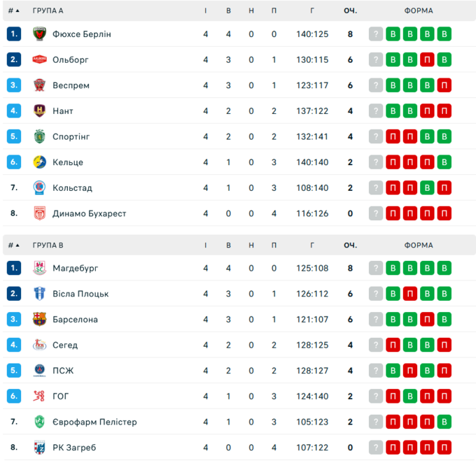 В группе В четвертую победу подряд одержал Магдебург. Команда на выезде со счетом 39:30 одолела ГОГ.
