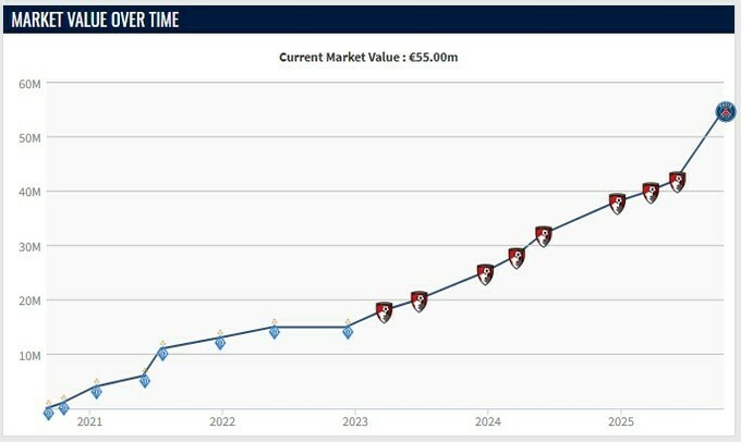 Сейчас, по мнению экспертов, 22-летний футболист стоит 55 миллионов евро. Это первое обновление его стоимости с момента перехода в ПСЖ летом 2025 года.