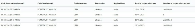 Харьковский «Металлист» получил трансферный бан от ФИФА. Информация о санкциях Международной федерации футбола появилась в официальном списке клубов, которым запрещено регистрировать новых игроков.
