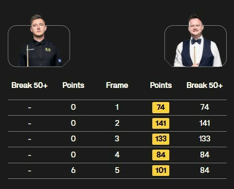 В центральном поединке дня Шон Мерфи всухую победил Кайрена Уилсона (5:0), чемпиона мира 2024. Невероятно, но Кайрен за 5 фреймов не сумел взять ни одного очка, а Шон набрал 533 и пять топ-серий (два сенчури 141 и 133).