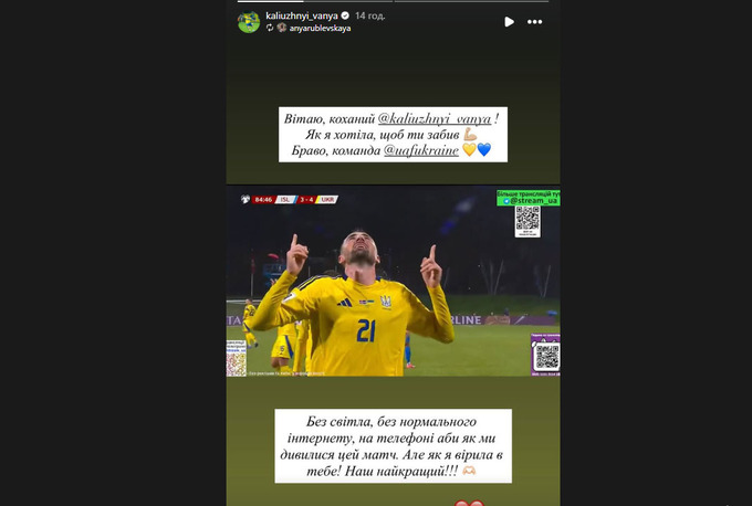 Полузащитник сборной Украины Иван Калюжный стал одним из героев победного матча против Исландии (5:3), а его жена Анна Калюжная поделилась искренней реакцией в сторис Instagram.