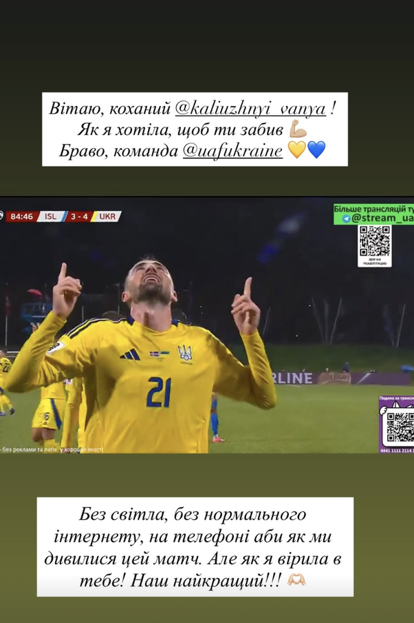 Жена хавбека «Металлиста 1925» Ивана Калюжного Анна отреагировала на дебютный гол мужа за сборную Украины в матче против национальной команды Исландии в отборе на чемпионат мира 2026.