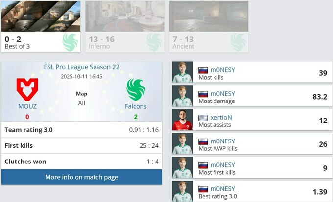 MOUZ останутся разочарованы – они не смогли воспользоваться нестабильной игрой Falcons на Inferno и показали слабую индивидуальную форму. Дориан «xertioN» Берман провел неудачный матч, а Адам «torzsi» Торжаш почти не влиял на игру. Лотан «Spinx» Гилади также выглядел блекло на Ancient.