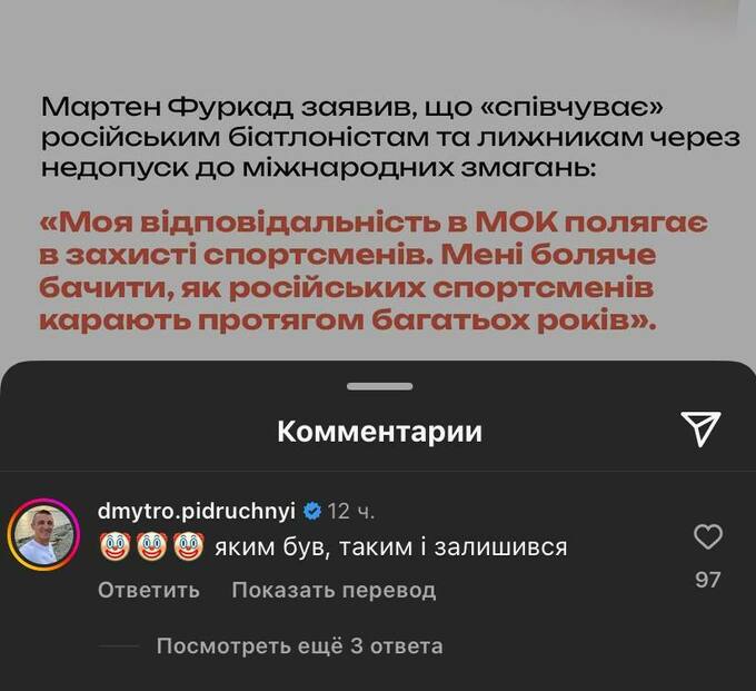 Это вызвало гнев у звездного украинского биатлониста Дмитрия Пидручного, который лаконично раскритиковал легендарного француза: «🤡🤡🤡, каким был, таким и остался», – написал Пидручный.