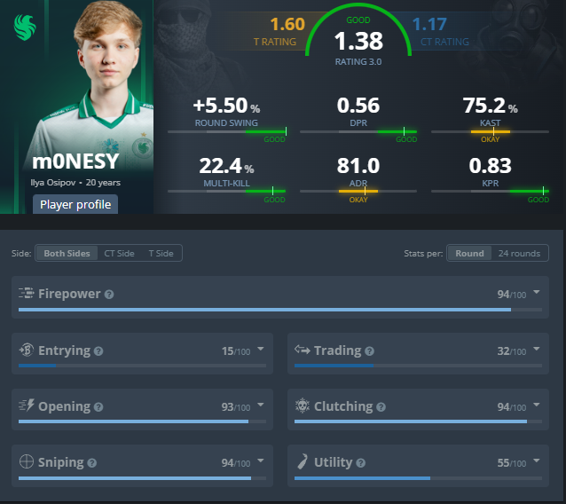 Несмотря на второе место, 20-летний игрок показал феноменальную статистику: рейтинг 1.38, +5,50% round swing и 1,12 убийства за выигранный раунд – лучший результат Ильи с момента его перехода в Falcons.