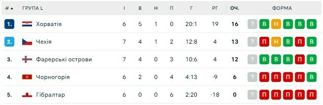 Первое место на 99,9% займет сборная Хорватии (16 баллов), а второе место должно остаться за чехами (13) в случае победы над Гибралтаром.