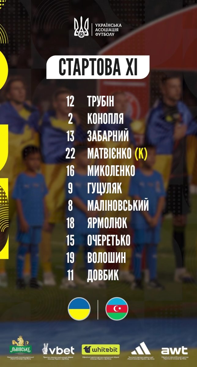 Украина: Трубин, Конопля, Забарный, Матвиенко, Миколенко, Гуцуляк, Малиновский, Ярмолюк, Очеретько, Волошин, Довбик.