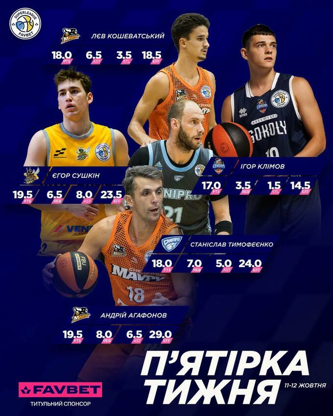 Лев Кошеватский («Черкасские Мавпы», 2 матча) – 18,0 очка, 6,5 передач, 3,5 перехвата, 3,0 подборов (РЕ 18,5)