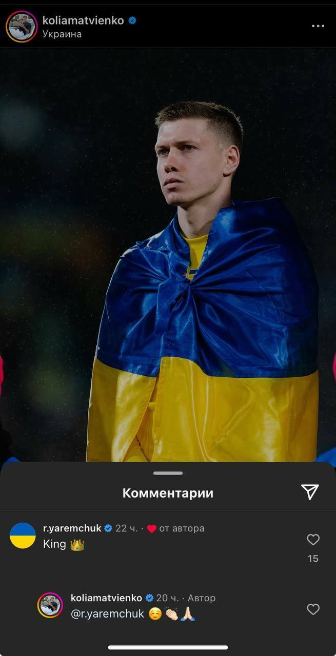 Капитан национальной команды Николай Матвиенко поделился эмоциями после октябрьских матчей сборной, написав сообщение в Instagram. В комментарии к Матвиенко «залез» Роман Яремчук, написав только одно слово: «KING».
