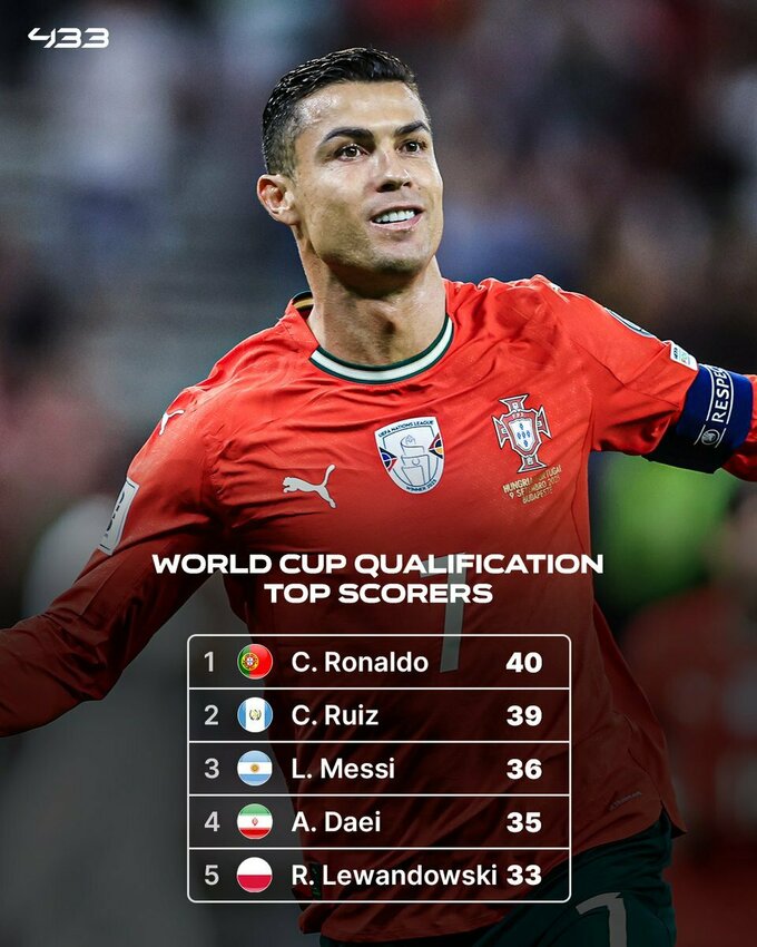 Криштиану превзошел достижение Кристиана Руиса из Гватамелы, на счету которого было 39 голов. У вечного соперника Роналду Лионеля Месси в активе 36 мячей в отборочных турнирах мундиалей.