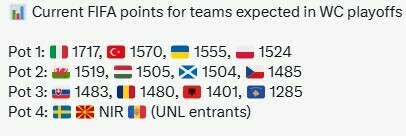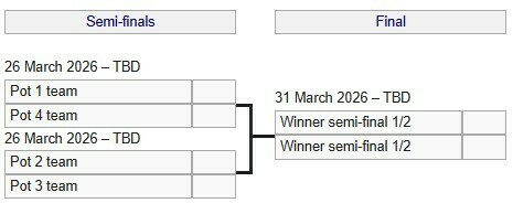 Определилось предварительное распределение корзин для стыковых матчей плей-офф, которые состоятся в марте 2026 года. Турнирная схема: 12 команд поделены на три пути по 4 команды. Полуфиналы (26 марта) и финалы (31 марта) состоят из одной игры. Три победителя плей-офф станут обладателями путевок на ЧМ-2026.