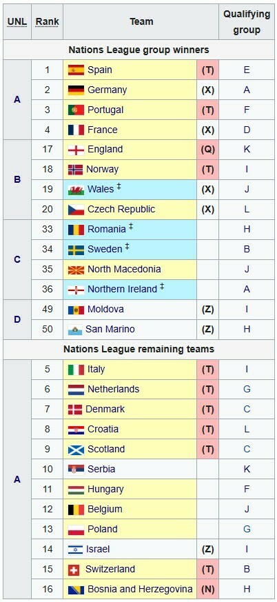 - Синий цвет – команда попадет в плей-офф благодаря Лиге наций