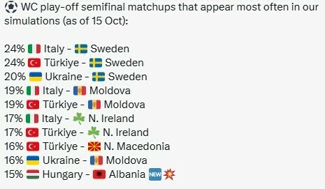 Также эксперты провели симуляции возможных пар полуфиналов плей-офф (март 2026 года). Оказалось, что наиболее вероятными соперниками для Украины могут стать Швеция (20%) или Молдова (16%).