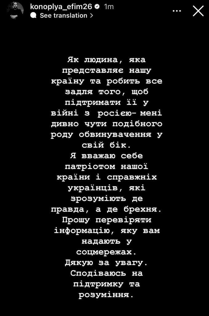 «Как человек, который представляет нашу страну и делает все для того, чтобы поддержать ее в войне с россией, мне странно слышать подобные обвинения в свой адрес. Я считаю себя патриотом нашей страны и настоящих украинцев, которые понимают, где правда, а где ложь. Прошу проверять информацию, которую вам предоставляют в соцсетях. Спасибо за внимание. Надеюсь на поддержку и понимание».