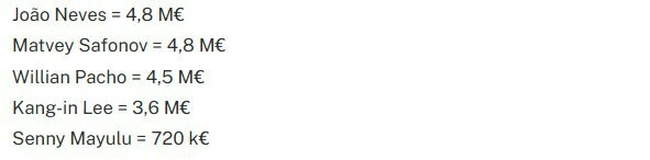 В первую пятерку также попали Маркиньос (13,4 млн евро), Лукас Эрнандес (13,2 млн евро), Ашраф Хакими (13,2 млн евро) и Уоррен Заир-Эмери (11,4 млн евро).