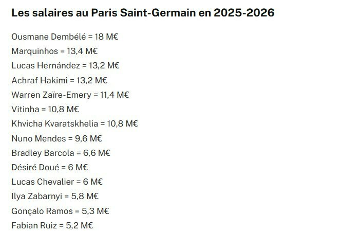 Портал 20 minutes составил рейтинг зарплат футболистов французского ПСЖ в сезоне 2025/26 – на первом месте оказался обладатель Золотого мяча Усман Дембеле с показателем в 18 миллионов евро.