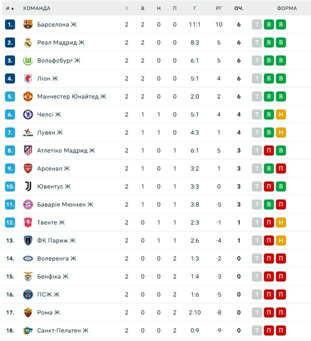 В турнирной таблице лидируют: Барселона, Реал, Вольфсбург, Лион, Манчестер Юнайтед (по 6 очков).