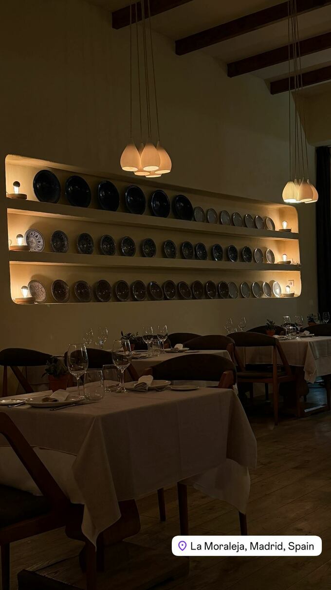 На фото – атмосферный зал элитного ресторана с мягким освещением и идеально сервированными столами. Именно в этом районе Мадрида часто ужинают известные футболисты, актеры и бизнесмены.