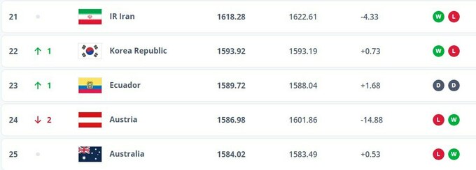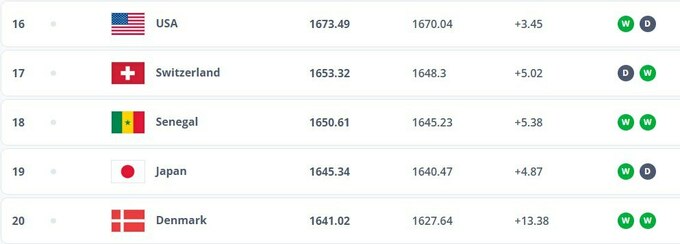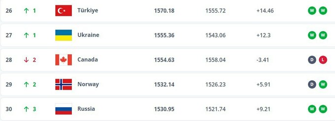 Сборная Украины обогнала Канаду и теперь занимает 27-е место, набрав 1 555,36 балла. Соперники украинской команды в отборе разместились на таких местах: