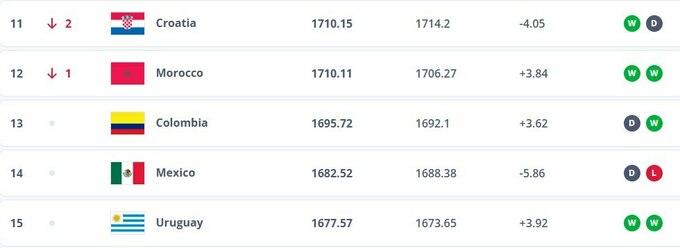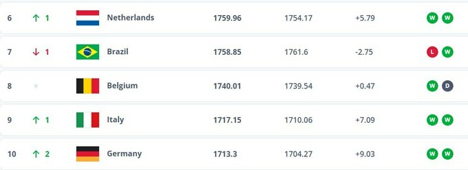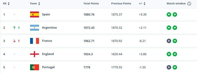 Лидером рейтинга осталась Испания, в тройке произошли изменения – Аргентина опередила Францию. Первую десятку покинула сборная Хорватии, которая опустилась с девятой позиции на 11-ю.