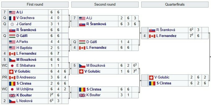 В полуфиналах сыграют: Жаклин Кристиан (Румыния) – Тереза Валентова (Чехия), Лейла Фернандес (Канада) – Сорана Кырстя (Румыния).