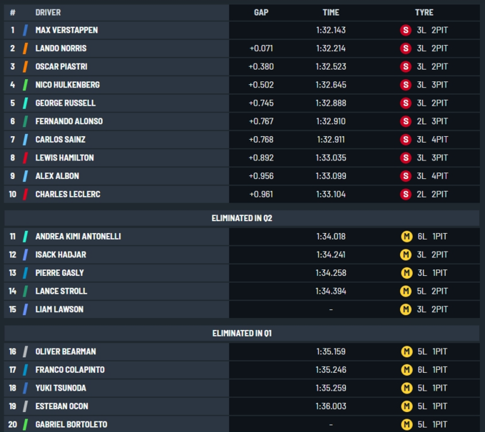 В топ-10 не пробились Андреа Кими Антонелли на Мерседесе и Исак Хаджар на Рейсинг Буллз.