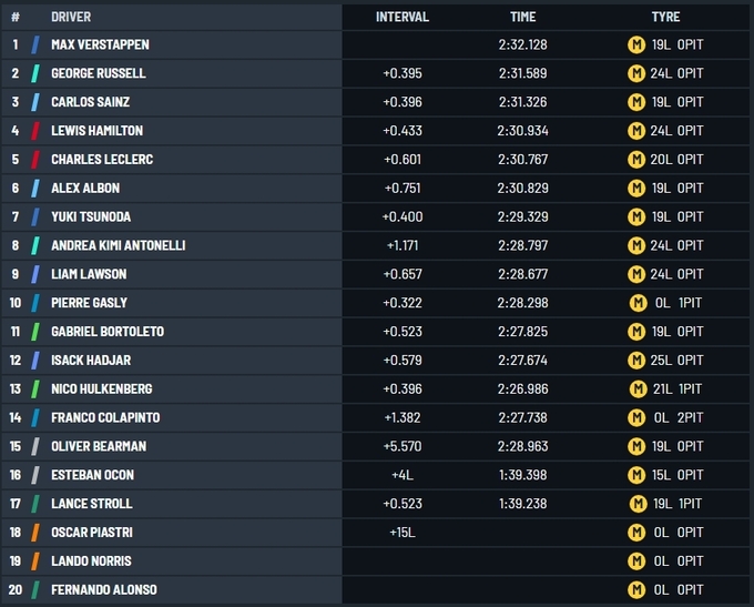 Расселл попытался атаковать Ферстаппена, но после одной неудачной атаки отстал и сохранил свою позицию.