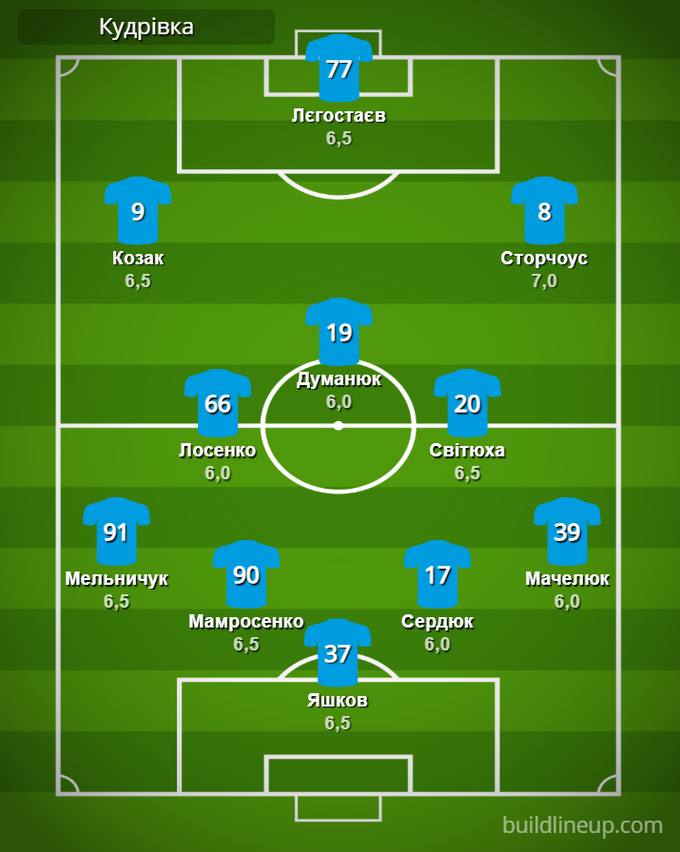 «Кудровка»: Яшков – Мельничук, Мамросенко, Сердюк, Мачелюк – Думанюк, Лосенко (Матвеев, 82) – Козак, Сторчоус (Коркишко, 82), Свитюха (Рогозинский, 65) – Легостаев (Литовченко, 82).