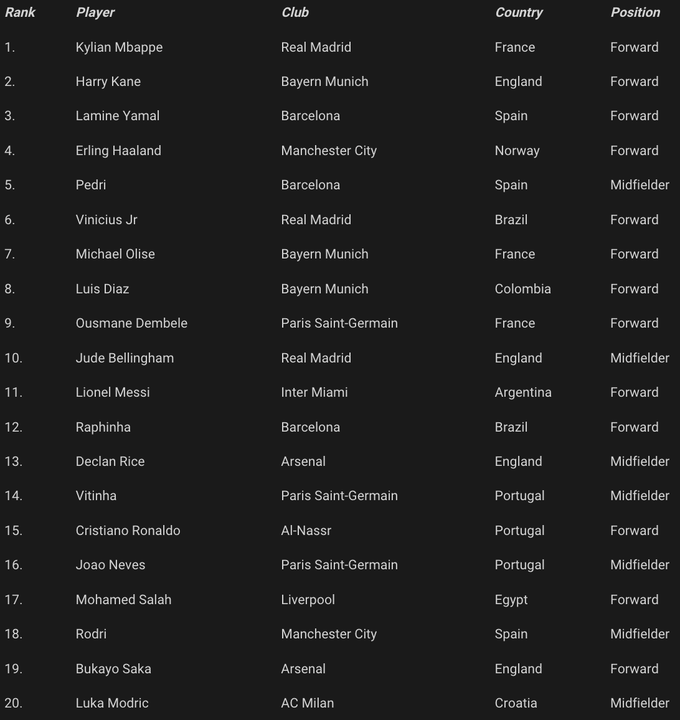 Лучший бомбардир Бундеслиги Гарри Кейн разместился на второй строчке, а за ним сразу идет Ламин Ямаль из «Барселоны».
