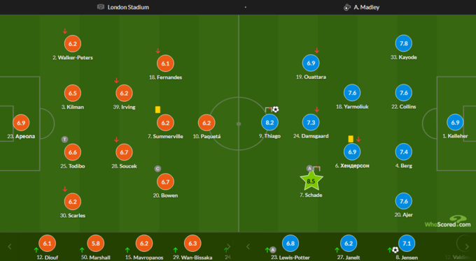 Лучшим по версии SofaScore стал фулбек гостей Микаэль Кайодо, на счету которого оценка 8.1. WhoScored выделил вингера «пчел» Кевина Шаде, который отличился одним голом и получил оценку 8.5.