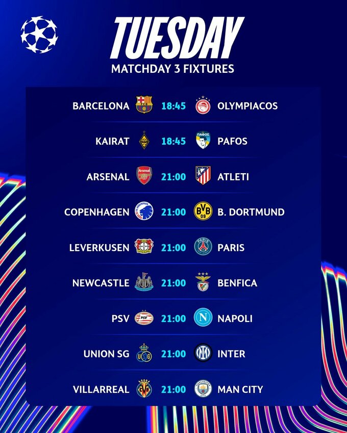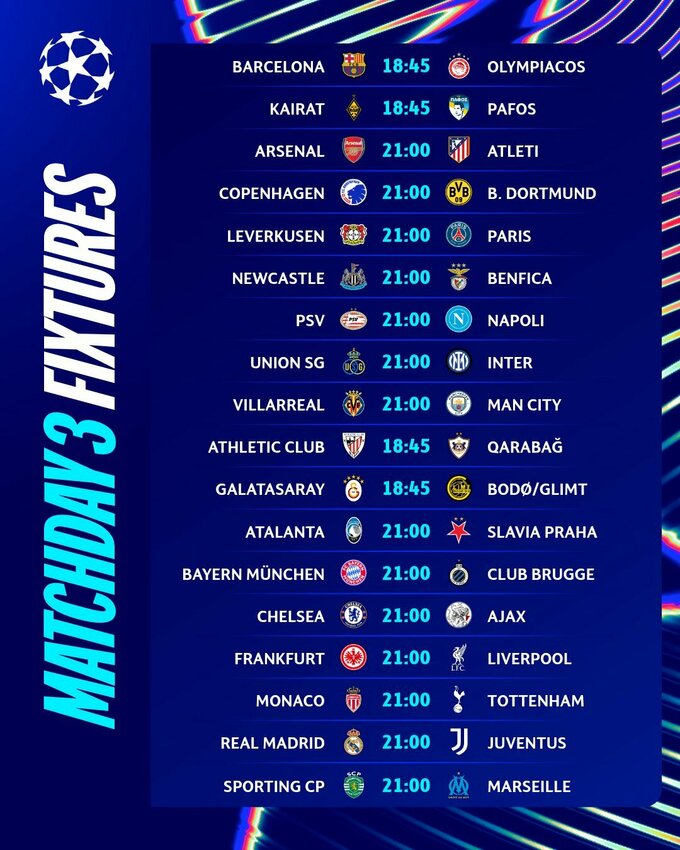 В 3-м туре наибольший интерес вызывают матчи: Барселона – Олимпиакос, Арсенал – Атлетико, Байер – ПСЖ, Вильярреал – Манчестер Сити (21 октября), Айнтрахт – Ливерпуль, Бавария – Брюгге, Реал Мадрид – Ювентус, Челси – Аякс (22 октября).