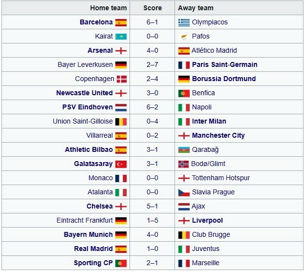 По 9 очков набрали ПСЖ, Бавария, Интер, Арсенал и Реал Мадрид