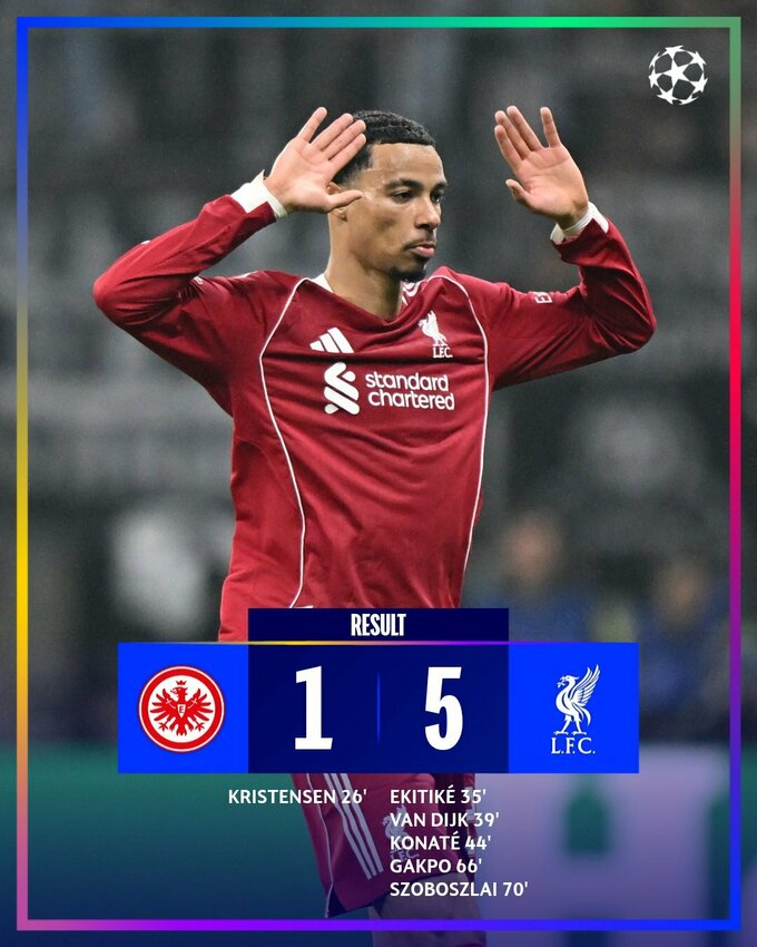 Голы: Кристенсен, 26 – Экитике, 35, Ван Дейк, 39, Конате, 44, Гакпо, 66, Собослаи, 70