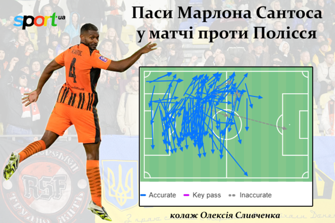Но подвох скрывается в другом. Из 120 точных пасов Марлон Сантос лишь одну успешно доставил в зону финальной трети. При этом, всего в финальную треть или штрафную соперника этот центрбек предпочел выполнить только три паса, из которых, как вы уже могли успеть подсчитать в уме, два оказались неточными. Иными словами, из пяти неточных пасов Марлона Сантоса почти половина пришлись на передачи, которыми можно было реально попробовать обострить игру. Все остальное – банальное перекатывание мяча на своей половине поля или в зоне центральной линии. Только посмотрите на топ-3 игровые связки Марлона Сантоса в матче против «Полесья»: Марлон Сантос – Бондарь (87 пасов друг другу), Марлон Сантос – Педро Энрике (55), Марлон Сантос – Ризнык (30). Выдающееся продвижение мяча, не так ли?