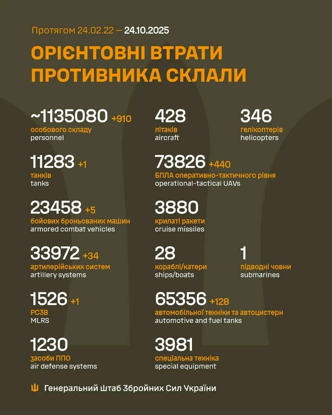 Предлагаем вашему вниманию подсчет общих боевых потерь россии с 24.02.2022 по 24.10.2025.