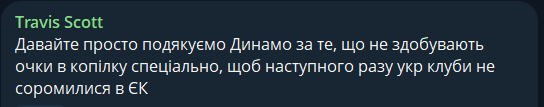 Travis Scott: Давайте просто поблагодарим Динамо за то, что не завоевывают очки в копилку специально, чтобы в следующий раз укр клубы не позорились в ЕК.