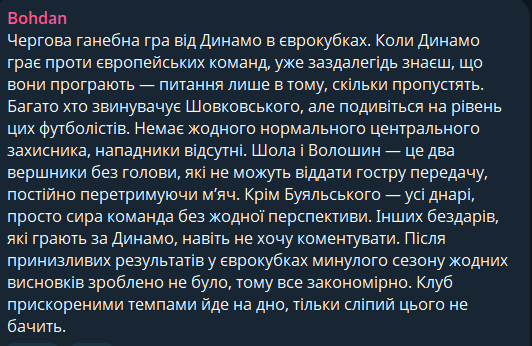 Bohdan: Очередная позорная игра от Динамо в еврокубках. Когда Динамо играет против европейских команд, уже заранее знаешь, что они проиграют вопрос только в том, сколько пропустят. Многие обвиняют Шовковского, но посмотрите на уровень этих футболистов. Нет ни одного нормального центрального защитника, нападающие отсутствуют. Шола и Волошин – два всадника без головы, которые не могут отдать острую передачу, постоянно передерживая мяч. Кроме Буяльского, все днари, просто сырая команда без всякой перспективы. Других бездарей, играющих за Динамо, даже не хочу комментировать. После унизительных результатов в еврокубках в прошлом сезоне никаких выводов сделано не было, потому все закономерно. Клуб ускоренными темпами идет ко дну, только слепой этого не видит.