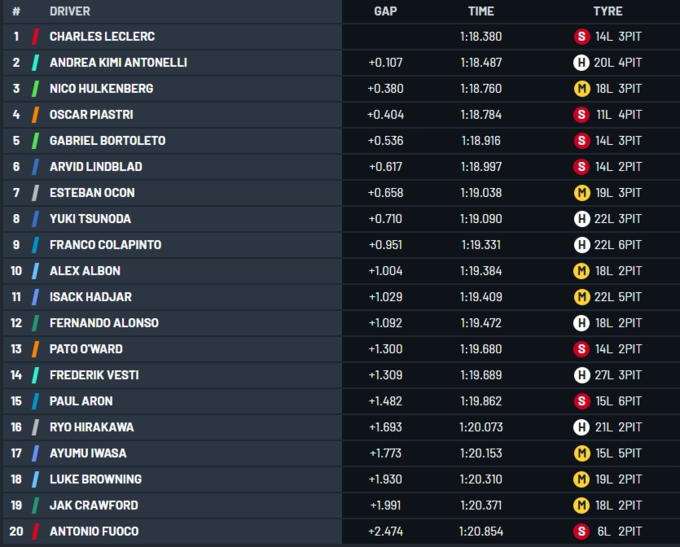 Что касается практики, то лучший результат показал пилот Феррари Шарль Леклер, который опередил Андреа Кими Антонелли и Нико Хюлькенберга.
