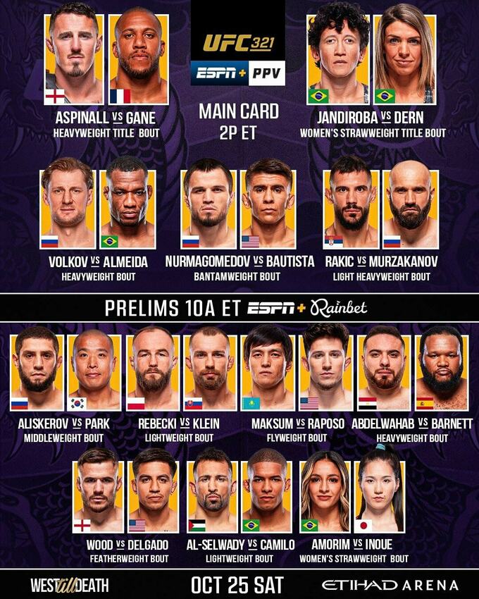 В субботу, 25 октября, на арене «Etihad Arena» в Абу-Даби (ОАЭ) состоится турнир по смешанным единоборствам UFC 321.