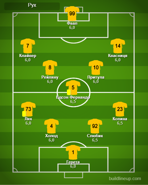 «Рух»: Герета – Лях, Холод, Слюбик, Копына (Роман, 76) – Эдсон Фернандо (Пидгурский, 87) – Клайвер, Рейляну (Слюсар, 76), Притула (Сапуга, 87), Квасница (Рунич, 68) – Фаал